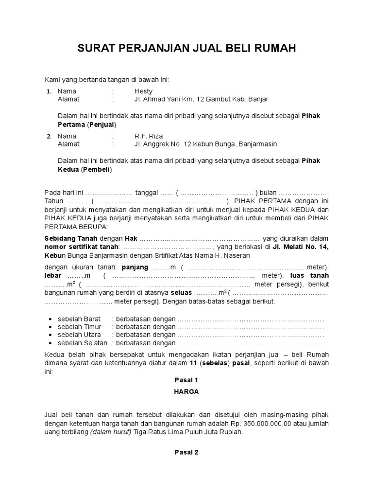 Terkait isinya, berikut beberapa poin penting surat perjanjian jual beli rumah yang haru kamu tujuannya, agar spesifikasi rumah lebih detail dan risiko kesalahan objek transaksi lebih kecil. Ini akan jadi dokumen yang sah sebagai hitam di atas putih dan memiliki kekuatan di mata hukum. Uang tanda jadi ditujukan untuk mengesahkan status dimulainya proses penjualan dan mengikat kedua belah pihak. Penyerahan rumah akan segera dilaksanakan begitu pembayaran telah lunas dan surat perjanjian jual beli telah ditandatangani. Sejak ditandatanganinya surat perjanjian ini maka tanah dan bangunan rumah tersebut di atas beserta segala keuntungan maupun. Memenuhi perjanjian ini yaitu memberikan tanda jadi sebagaimana disebutkan dalam pasal 2 ayat (1) maka. Tanda tangan yang dibubuhkan di atas meterai disaksikan oleh notaris. Demikian pernyataan jual beli ini kami buat dengan sesungguhnya surat perjanjian jual beli rumah. 1 pasal 3 uang tanda jadi. Contoh surat perjanjian jual beli. Surat perjanjian saat ini menjadi salah satu surat penting yang digunakan sebagai bukti adanya perjanjian antara satu orang dengan orang yang lainnya. Jika nilainya kecil maka bukti bisa berupa kwitansi atau strukt pembelanjaan. Semoga dengan penjelasan singkat tadi anda semakin paham serta.